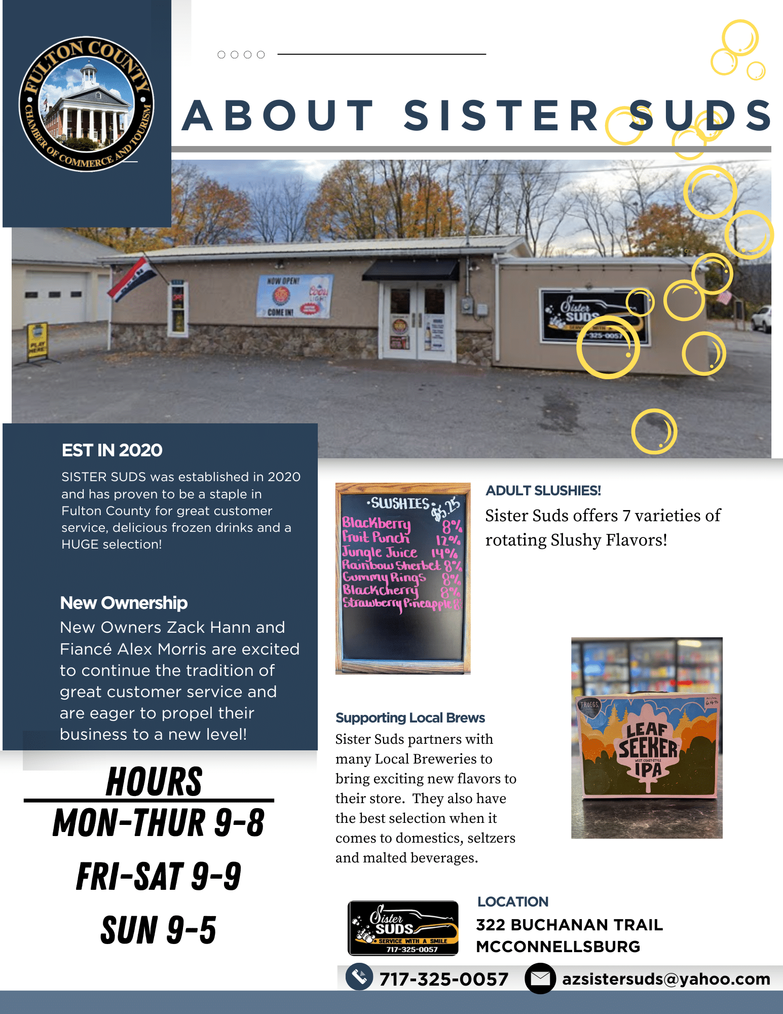 Sister SudsSisters Suds is the Premier Beverage Distributor in McConnellsburg, PA! They have the largest walk in cooler in the area with a great selection!