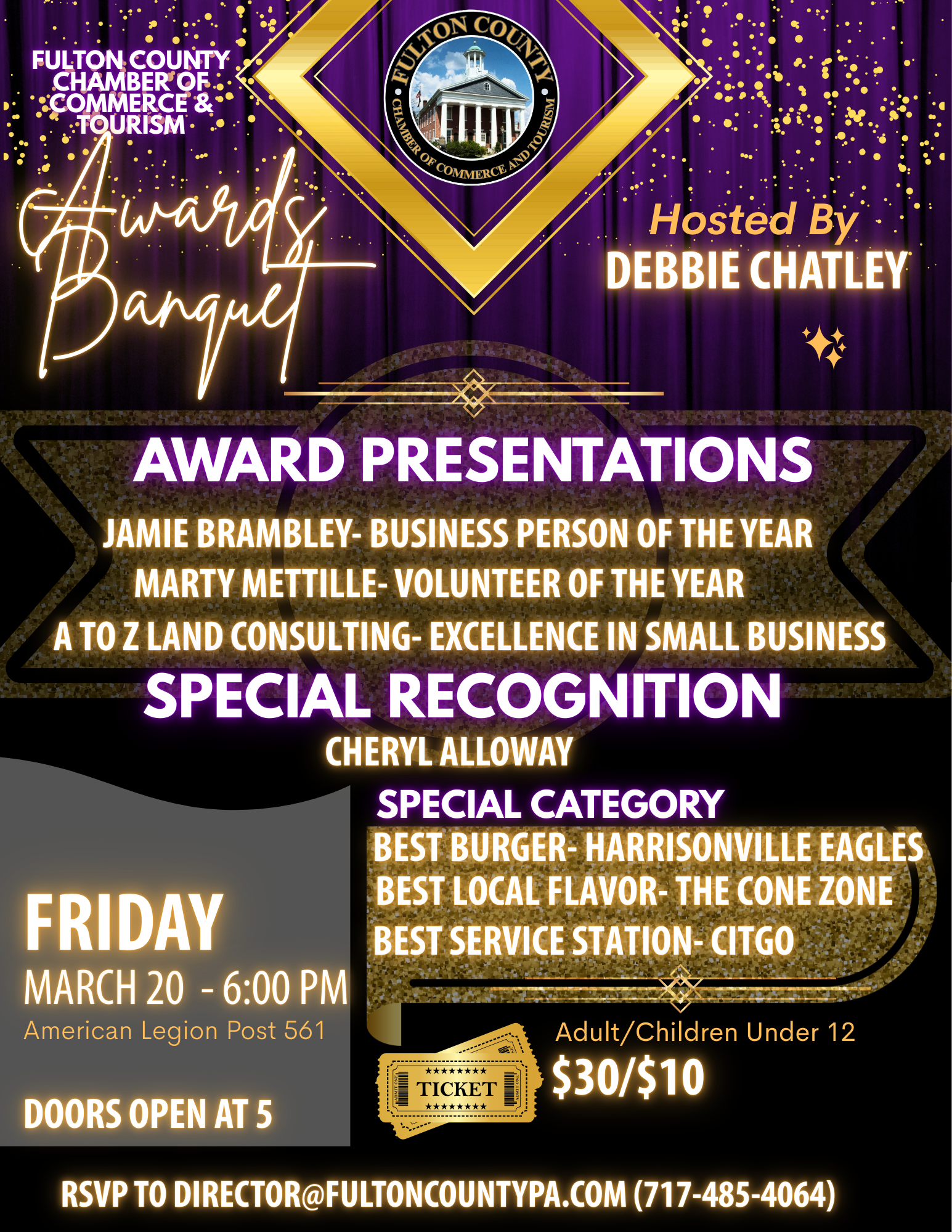 Join us for a night of Awards, Food, Drinks and Networking! Come Celebrate Fulton County Businesses with the Chamber.