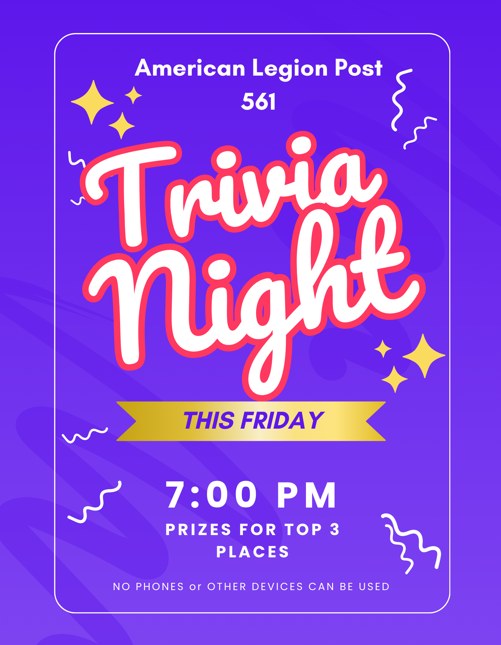 Trivia Night Trivia night at the American Legion Post 561 + Add to Google Calendar + iCal / Outlook export The event is finished. Date Sep 26 2025 Expired! Time 7:00 pm - 8:00 pm Location American Legion Post 561 411 North Fifth Street, McConnellsburg, PA Share this event