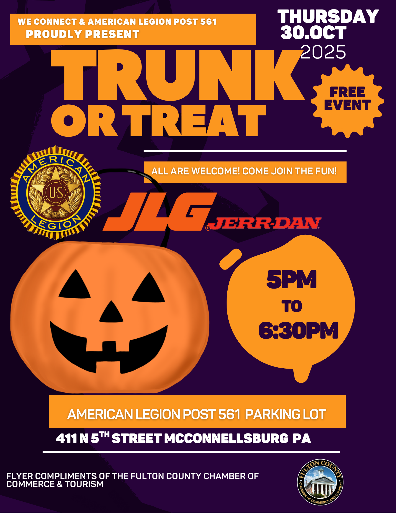 TRUNK OR TREAT! We Connect & American Legion Post 561 will host Trunk or Treat on OCT 30th from 5 pm to 6:30! Come Join the Fun! + Add to Google Calendar + iCal / Outlook export Date Oct 30 2025 Time 5:00 pm - 6:30 pm Location American Legion Post 561 411 North Fifth Street, McConnellsburg, PA Share this event