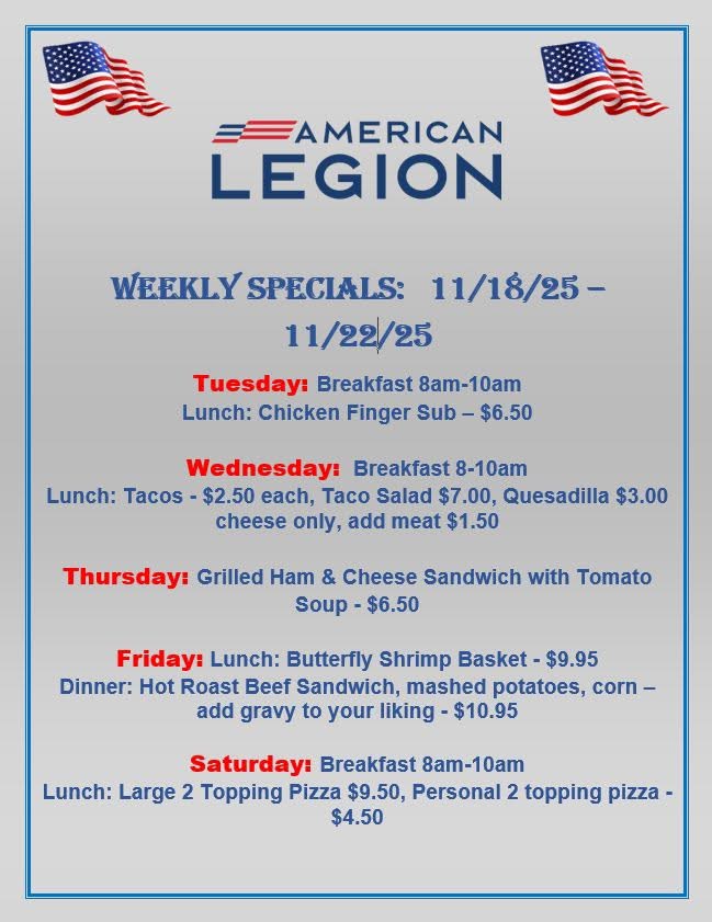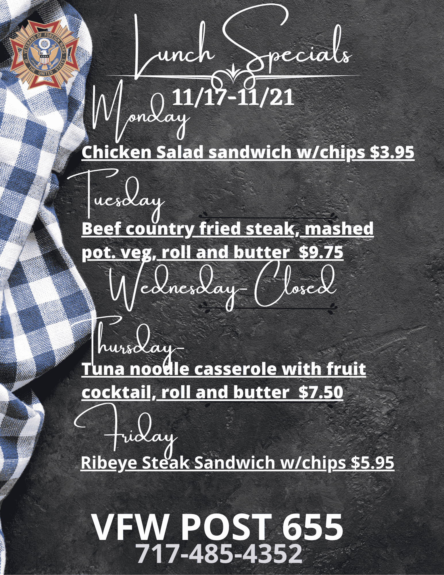 Located in McConnellsburg, The American Legion Post 561 offers great member benefits and is always a champion of community. With a full menu and weekly specials, the American Legion is always the place to be! Dining is open to the public!